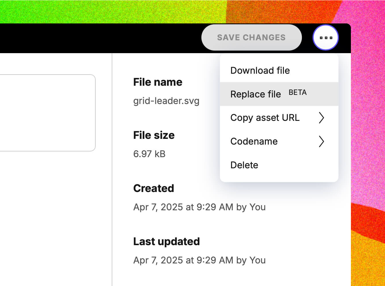 To replace an asset, open its detail view and select the “Replace file” option.