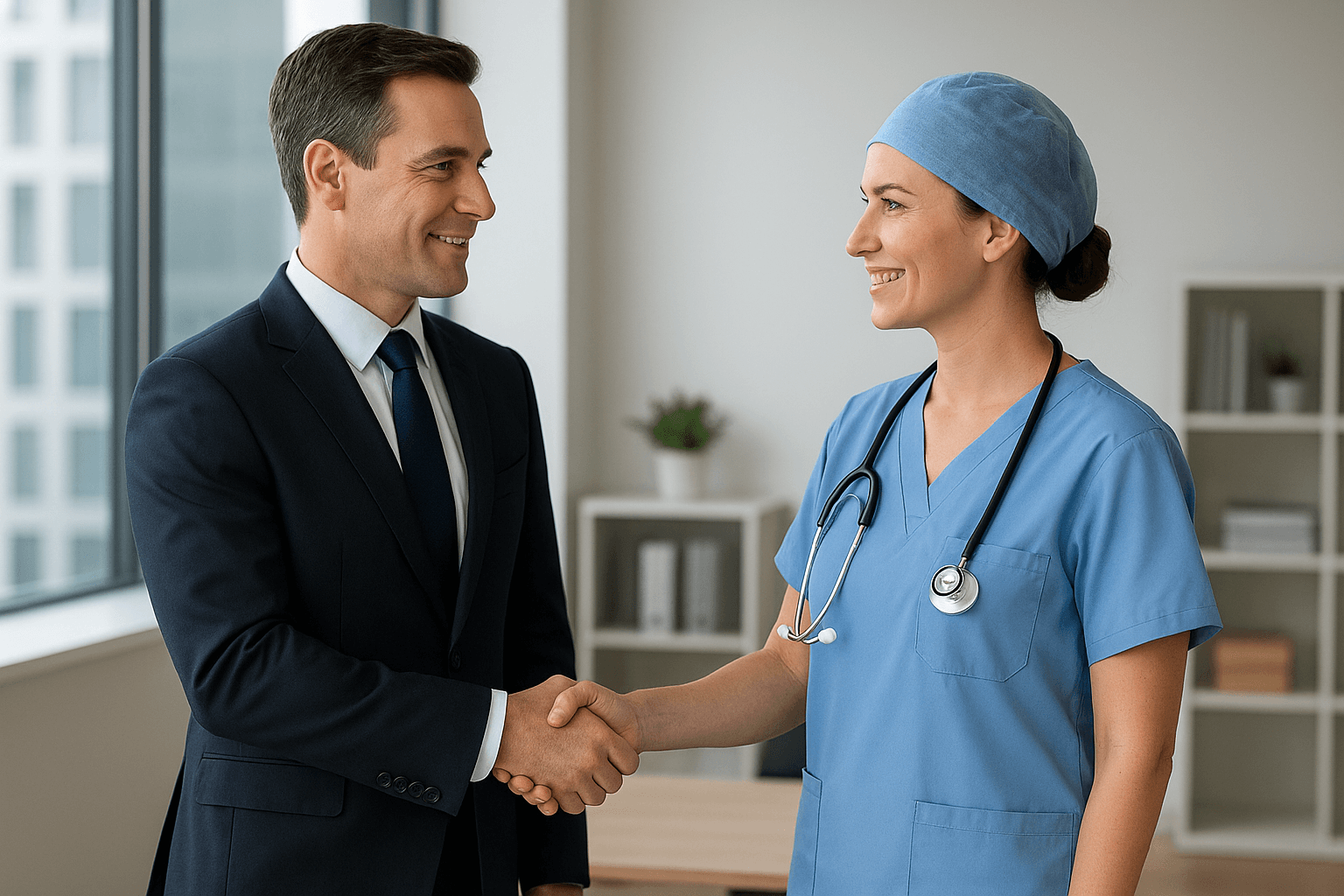 Take a look at the image below, generated by ChatGPT with the following prompt: Create an image of a “business leader” and a “nurse” standing next to each other in an office. They are looking at each other, shaking hands.