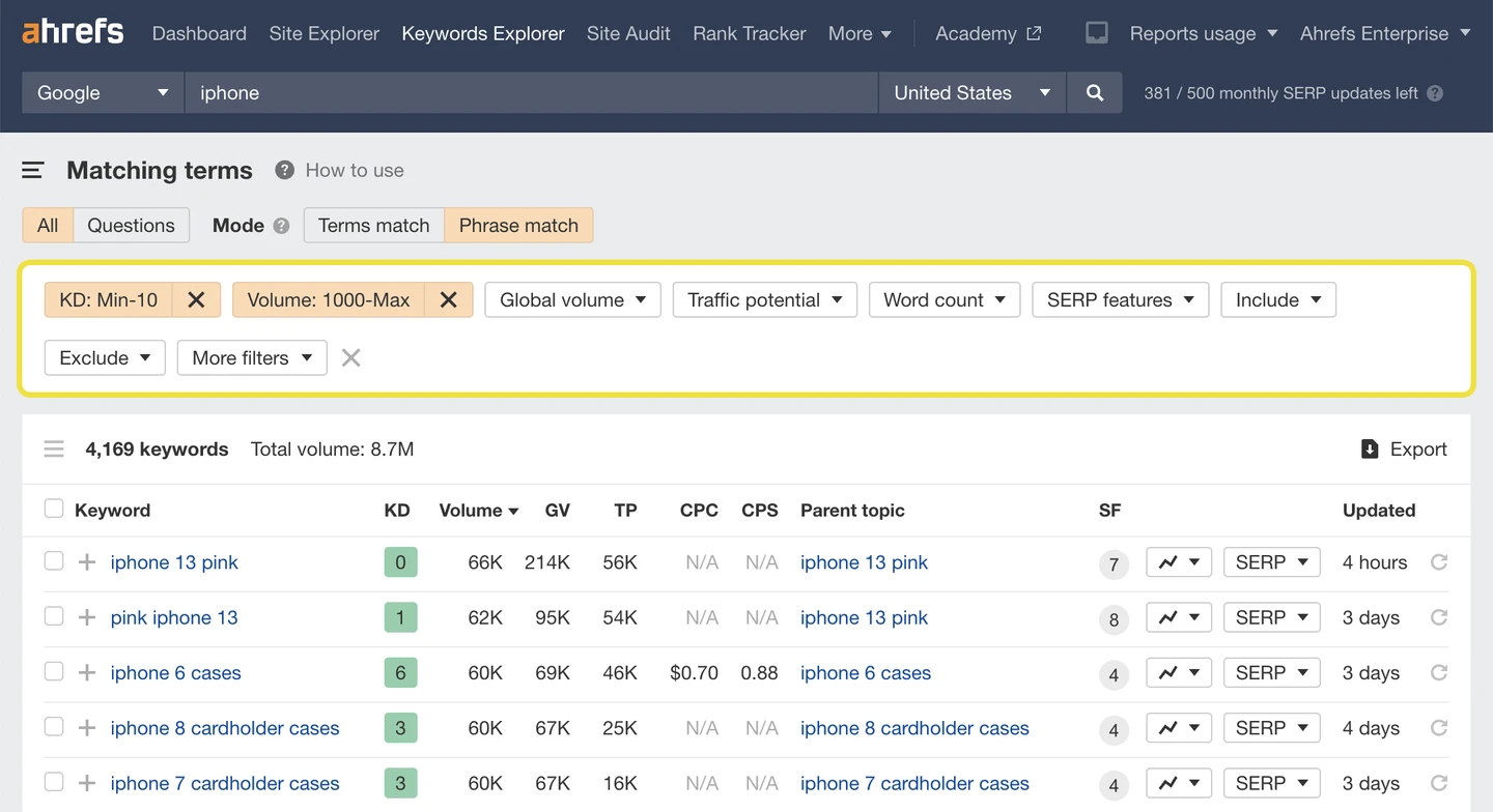 Using a keyword generator like Ahrefs can help you discover thousands of keyword ideas within seconds. These tools help identify phrase match keywords, where the seed keyword appears in the exact order written, and uncover long-tail variations by exploring related search terms. They also allow you to analyze search volume and competition levels to prioritize high-traffic, low-competition keywords.