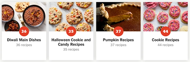 A recipe, collection, and guide are distinct objects with different purposes. But when presented in cards, they are only subtly different in appearance—perhaps too subtle for new or casual users to notice. The sameness of the card layout has overwhelmed the slight differences in the cards. Perhaps the differences would be more explicit and easier-to-notice with additional content elements, instead of relying solely on visual styling to differentiate content types.
