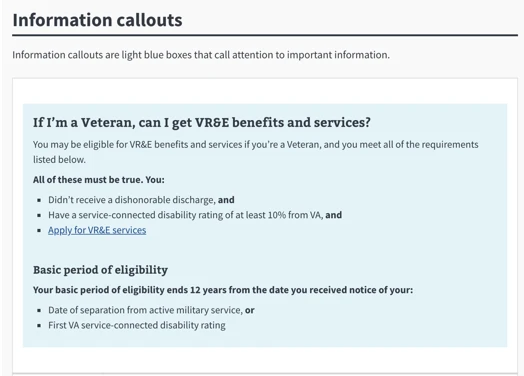 We can see how text can be presented in an information callout from the Veterans Administration’s design system. The example features real text that shows how the copy is formatted using bullets, headings, and bolding.