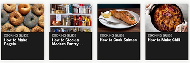 Jayne Lee, a product designer on the NYT Cooking team, writes: “Our cards provide an abbreviated look into the content, whether it is a recipe, a collection or a guide. These three content types are fundamentally different, so we made them visually distinct.”