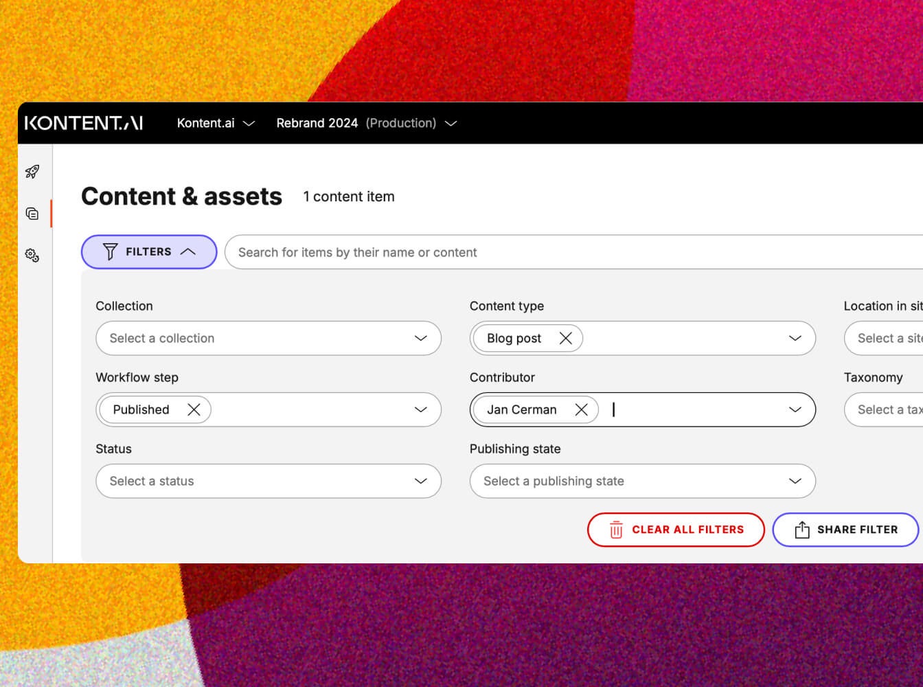 What’s great for me as an editor is that a CMS like Kontent.ai lets you filter by content type when you’re searching inside a project that has thousands and thousands of content items: