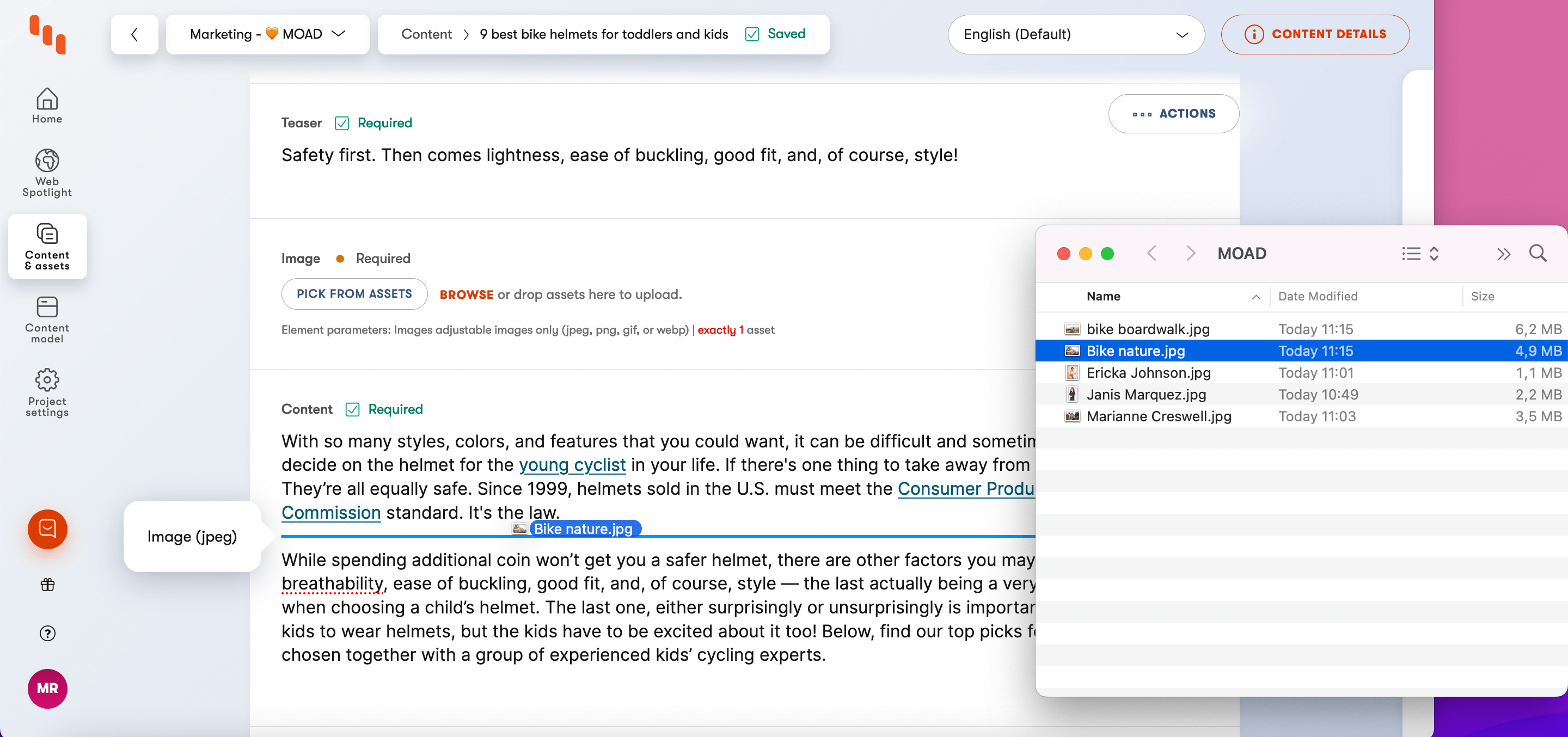 Drag & drop for files into rich text elements: This is a feel-good update that creators will notice right away. In Kontent.ai, easily drag and drop physical files directly to the rich text editor! From there, image files are uploaded as assets and added as images into the element content, while non-image files are uploaded as assets and added as links.