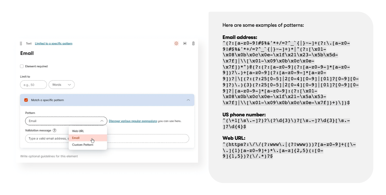 Helpful regex validation updates: Don’t feel like looking up the regular expression for validating an email again? Choose from commonly used regular expressions directly in Kontent.ai when setting them on content elements, and enjoy the benefits ASAP. Another important improvement: using regular expressions to validate URL slugs to have more control over how your URLs are built.