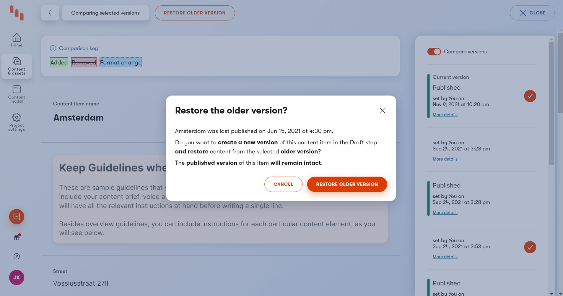 Streamlined flow for restoring older versions: Stay in the zone because it’s now possible to directly restore an older version of a published content item. There’s no need to create a new version of the item first—the item goes to its first workflow step automatically. Additionally, restoring an archived content item from an older version can also be done directly.