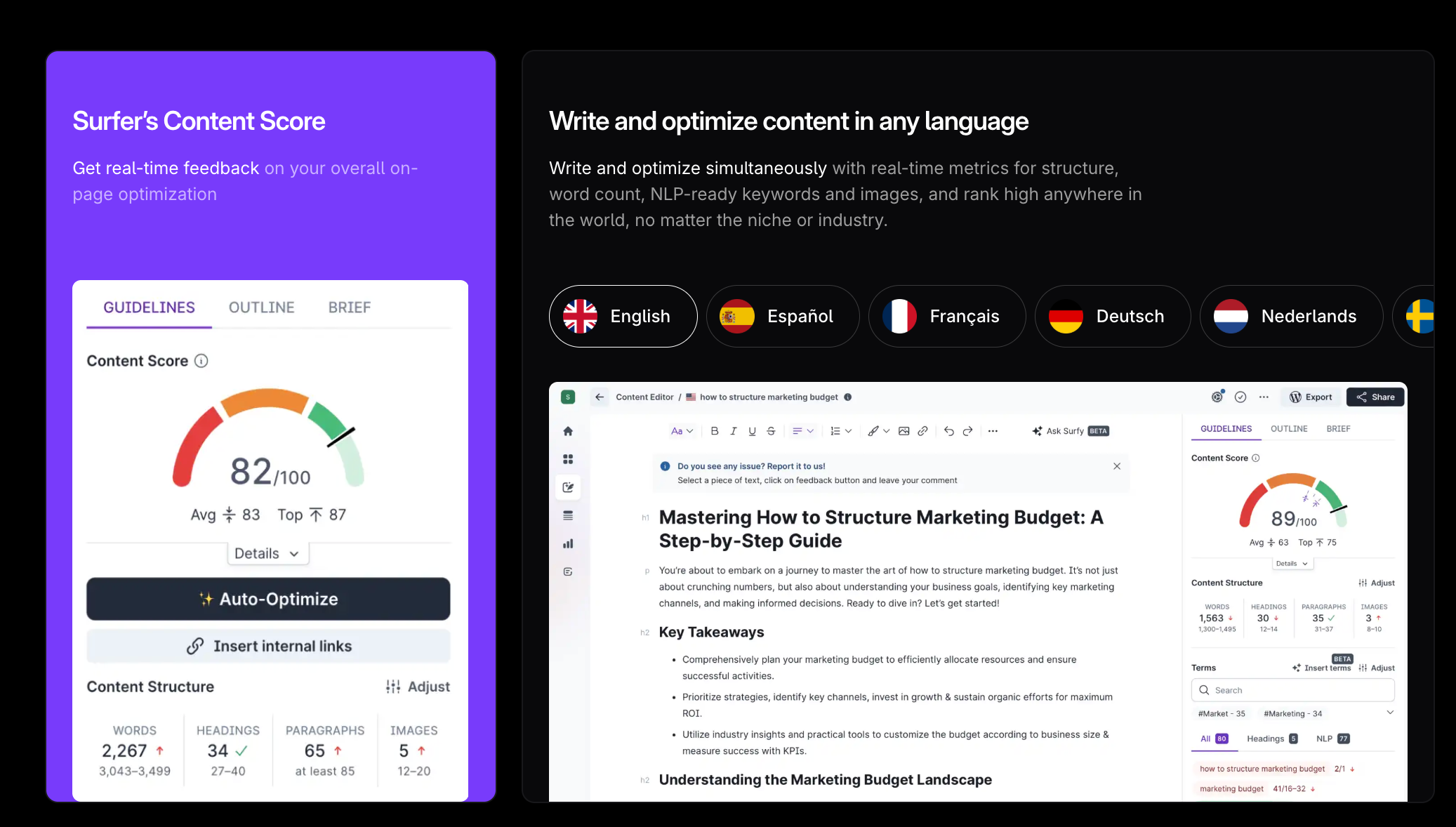 Surfer SEO | Optimizing written content for better rankings | Real-time SEO scoring and keyword suggestions |