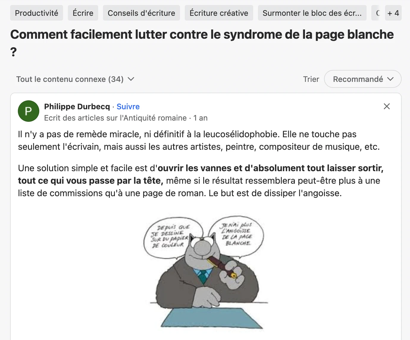 Below is another example from French Quora: “Comment facilement lutter contre le syndrome de la page blanche ?” (How to fight writer’s block easily?). You can use it in two ways: