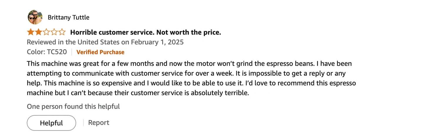 As an example, you can take the Amazon review of a coffee machine below. That review highlights a clear pain point: bad customer service. Teams can spin it into a new article by focusing on the pain point of bad customer service and the broader lessons it implies. Here are a few possible angles: