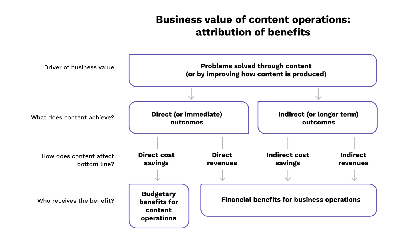 Content supports numerous business operations functions, which both directly and indirectly benefit from the content. The financial benefits accrued from published content are often enjoyed by a different part of the organization than the organizational unit producing the content. This organizational separation of the content operations from the business operations that the content is supporting can mask the contribution of the content to the resulting business outcomes.