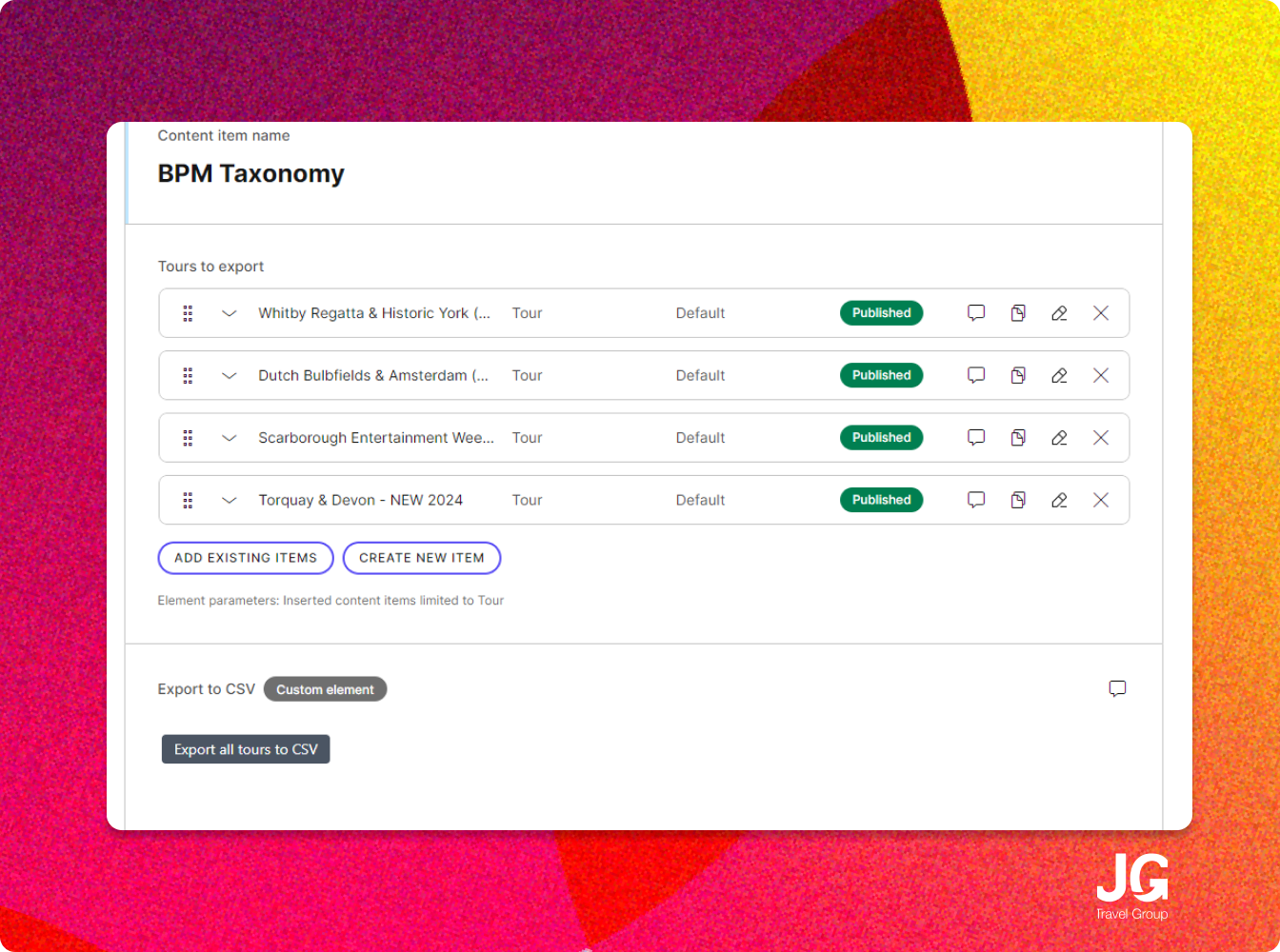 An example of The JG Travel Group’s unique export module in Kontent.ai