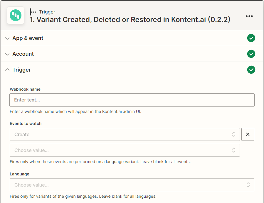 Triggers are always the first step of a Zap because they define when a Zap should run. With the Kontent.ai integration, you only need to configure the Zap in Zapier. The integration creates the webhook in Kontent.ai automatically when you turn the Zap on and deletes it when you turn it off.