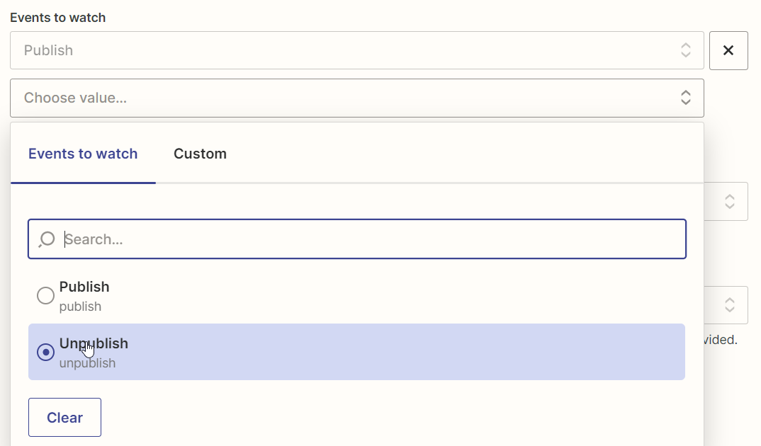 Each trigger in the Kontent.ai integration has an Events to watch field where you can specify one or more actions that trigger the Zap. For most triggers, if this is left empty, the Zap will run when any of the actions are performed.