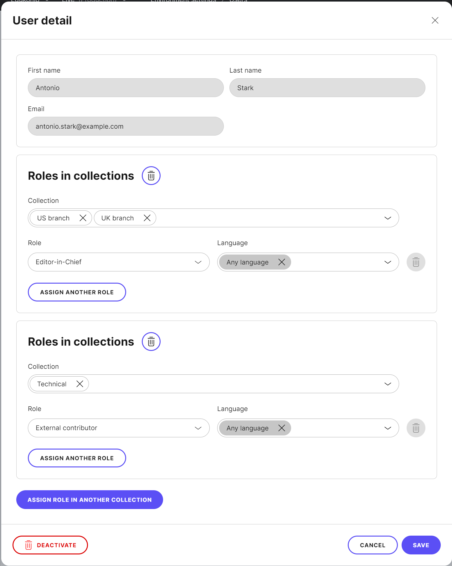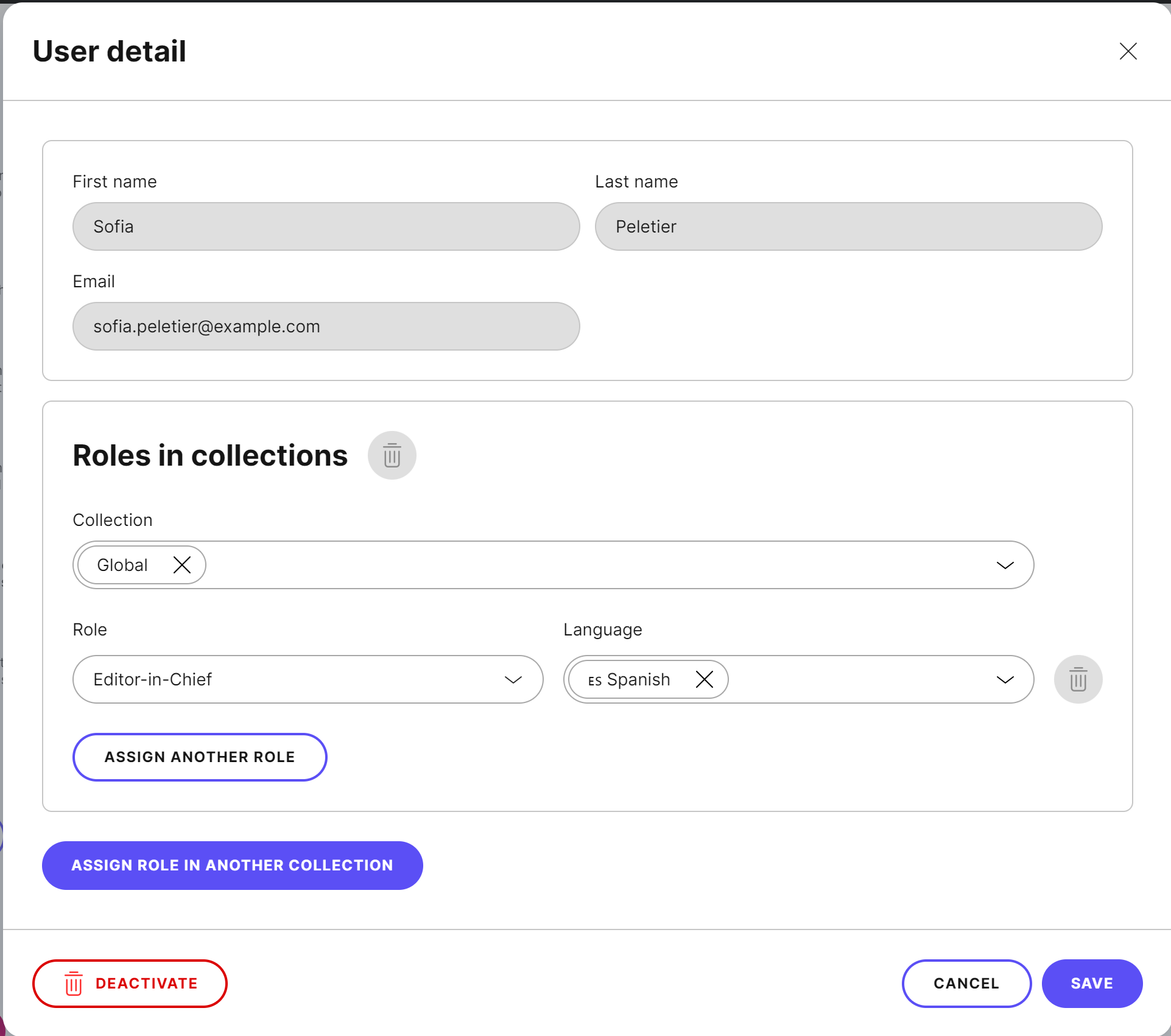 By default, new users have a single role for content in all collections and languages. If you’ve already mapped and established roles for your users, you can assign your users to work on content in specific collections and languages.
