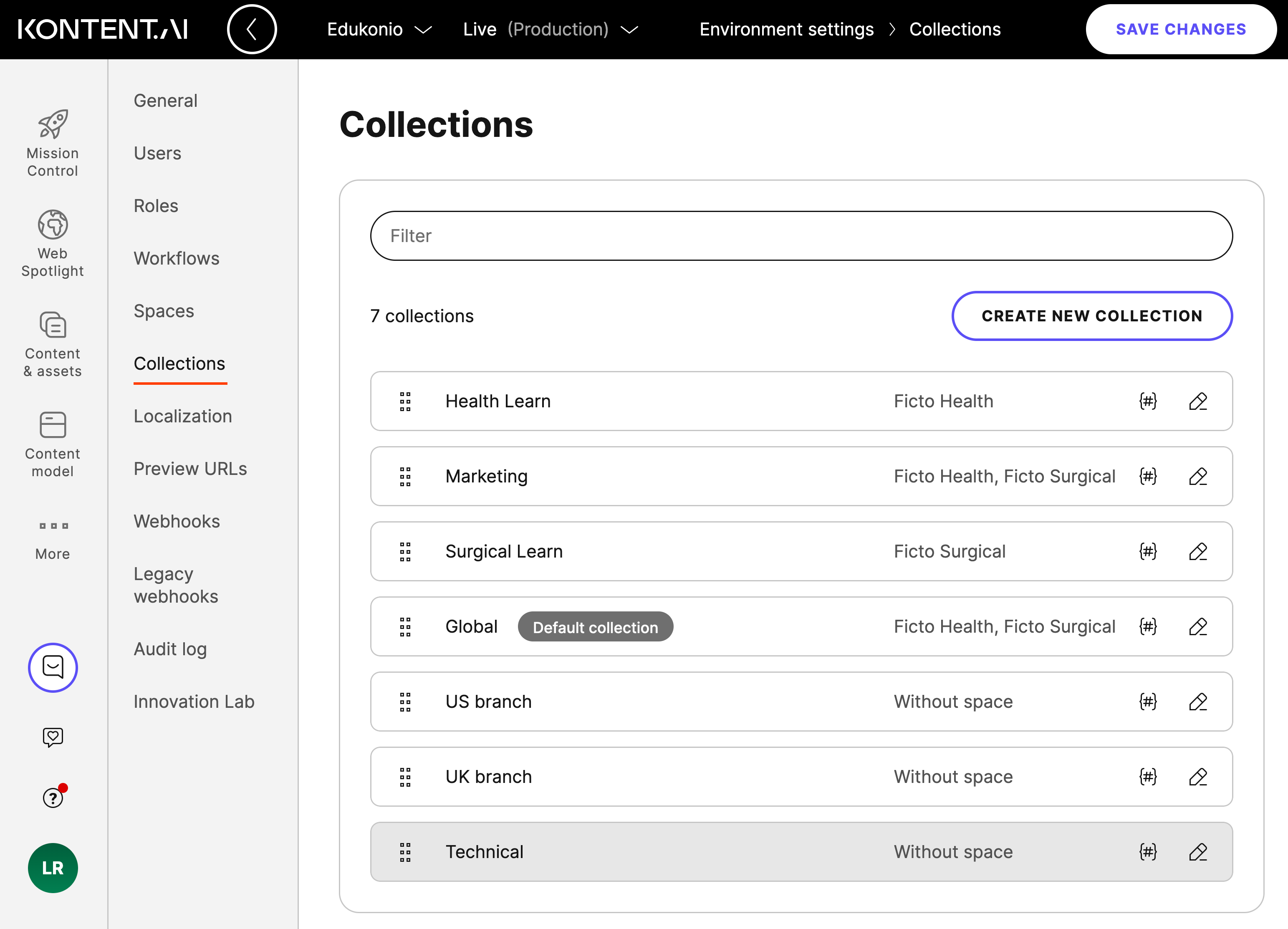 If you use spaces to manage multiple websites within one project, you can connect collections to the spaces. Assigning collections to spaces provides a clear overview of what content belongs to which website and simplifies the range of choices content creators have when previewing content in such a project.