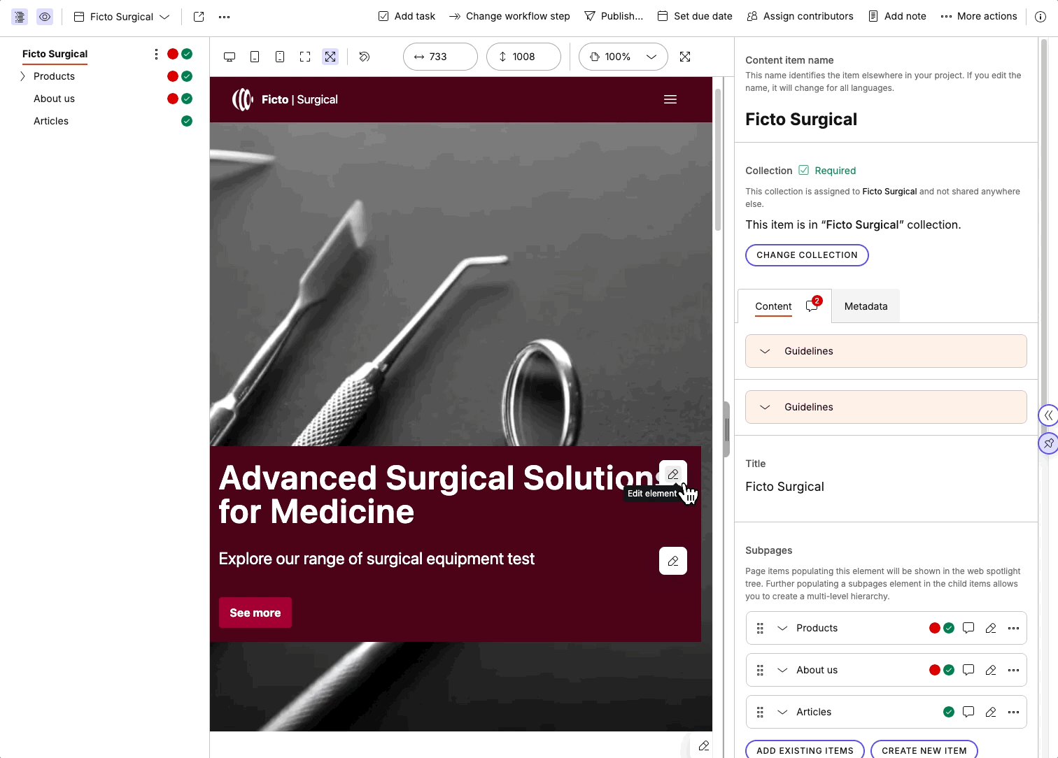 The live preview provides an in-context visual of your content across your channels while editing in real time without switching tabs. Your editors can easily produce and update content based on the context of your channel.