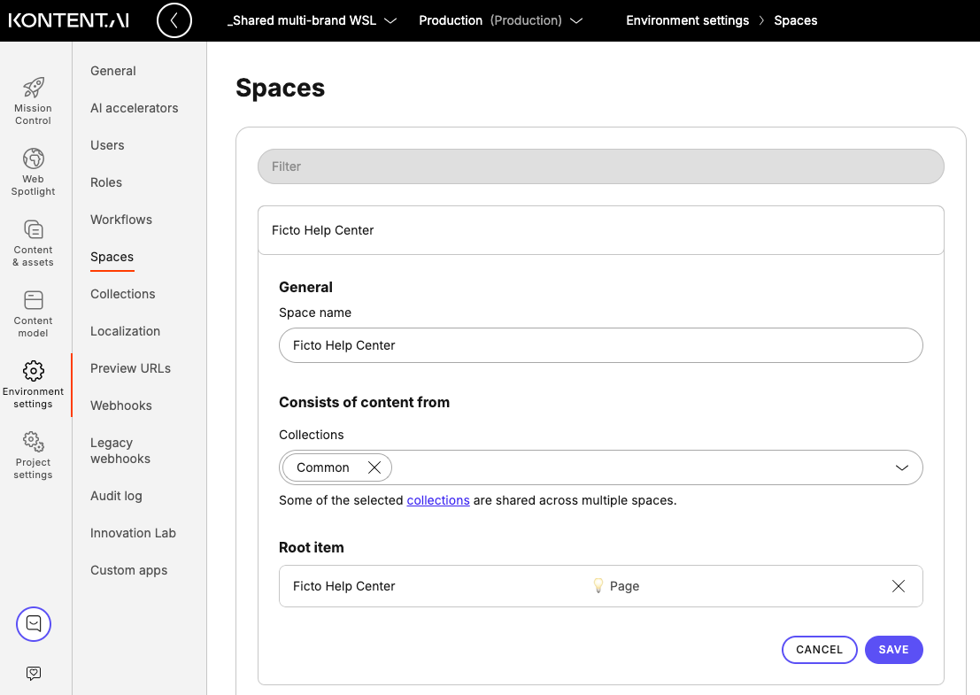 Your setup is done for this space. Go to your root item to start creating content and building the hierarchy. To set up another space for your live preview, repeat steps 2–4 in the other space.