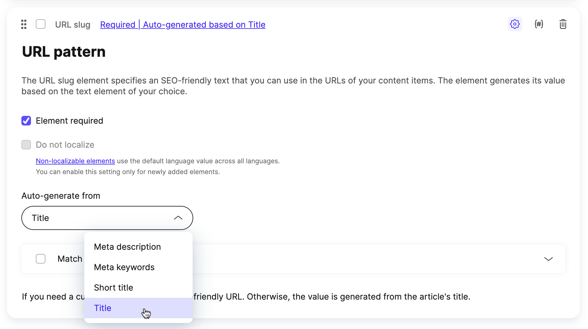 Because the URL slug element can generate its value from any textelement, you can use a different URL slug for each language variant of your content items.Let’s look at an example of using a URL slug in a content type.