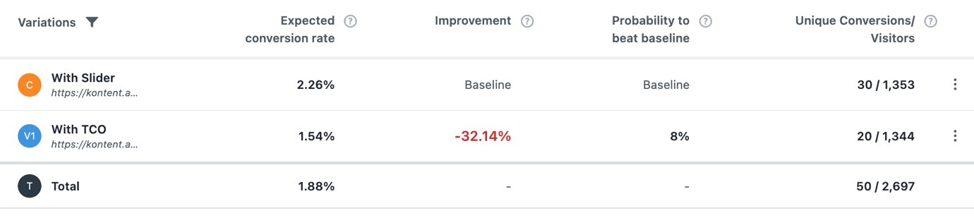 And the results? The A/B test showed an expected drop in the conversion rate of 32% if we were to use the tested version.