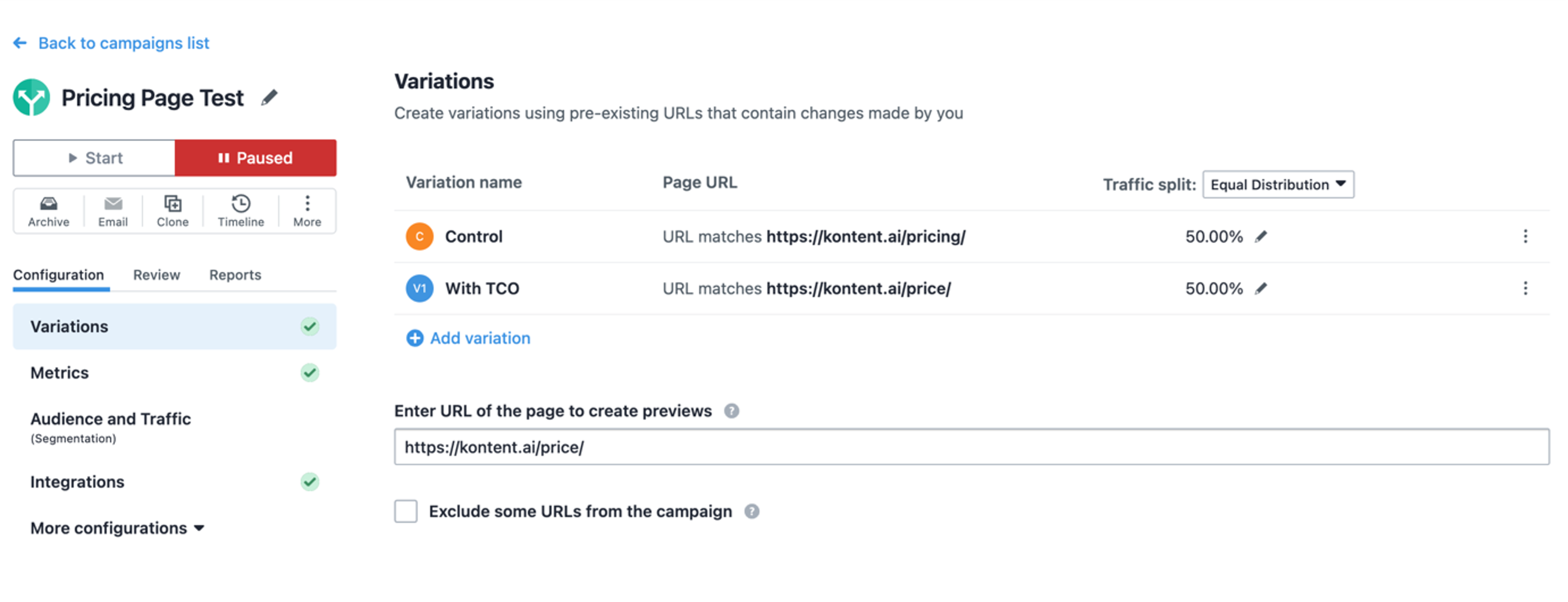 Setting up an A/B test with VWO is straightforward. Start by creating two slightly different landing pages. You can easily duplicate an existing landing page in Kontent.ai, make the necessary changes—such as updating the website copy using our AI features—and ensure that each version has a unique URL.