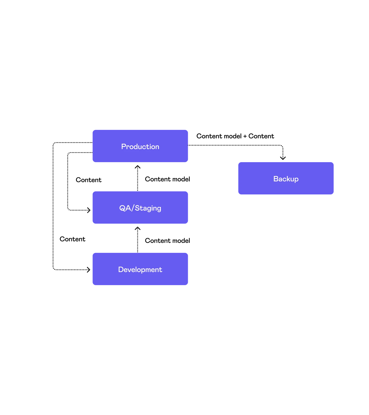 Environments in Kontent.ai create different spaces to work with your content, so it’s possible to test changes in a safe way before introducing those changes to a live site. Most organizations use an environment model similar to this one: