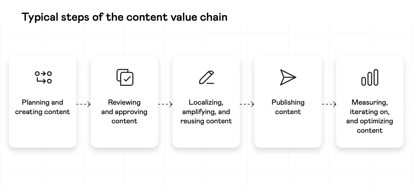 There are a lot of terms related to moving content from ideation to publication and beyond—like the content lifecycle, content supply chain, content development, and more. We find it’s easiest and most actionable to think about content production as a “value chain”.