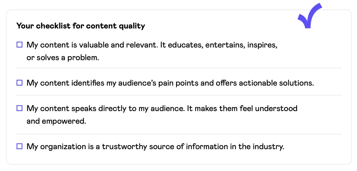 Content velocity is the speed at which content is produced and delivered to meet the ever-changing demands and trends of your audience. It can be hard to pull off, especially when quality is so important. You don’t have to hit every point in the checklist below perfectly, but adopting a just-in-time approach to content creation ensures that your content is timely and relevant. Slow content velocity can lead to missed opportunities to engage with your audience, falling behind competitors who are more agile, and a decline in brand visibility.
