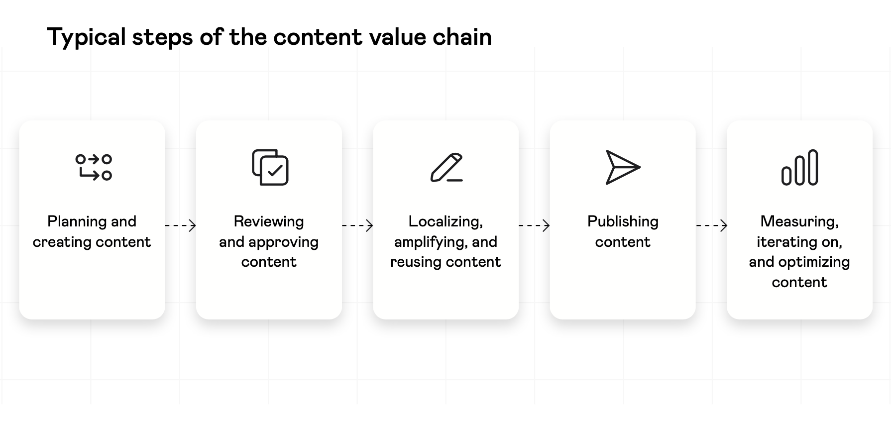 There are a lot of terms related to moving content from ideation to publication and beyond—like the content lifecycle, content supply chain, content development, and more. We find it’s easiest and most actionable to think about content production as a “value chain”.