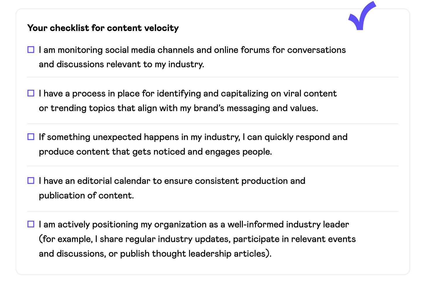 Content velocity is the speed at which content is produced and delivered to meet the ever-changing demands and trends of your audience. It can be hard to pull off, especially when quality is so important. You don’t have to hit every point in the checklist below perfectly, but adopting a just-in-time approach to content creation ensures that your content is timely and relevant. Slow content velocity can lead to missed opportunities to engage with your audience, falling behind competitors who are more agile, and a decline in brand visibility.