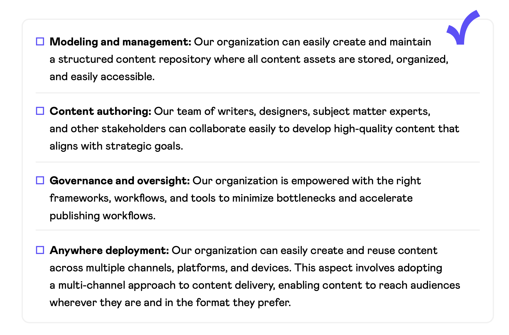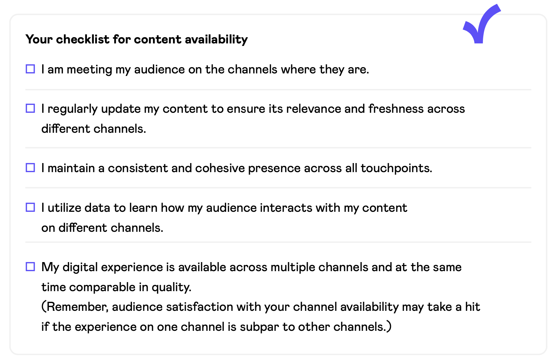 Content availability can be challenging because it often requires coordination beyond the content team. It’s about making sure your content is easily accessible across various channels and platforms like websites, social media, email, and mobile apps. If content isn’t available where your audience expects to find it, you might see a drop in website traffic, conversion rates, and overall market competitiveness. Again, not every checkbox below is feasible to cover ASAP, but ensuring broad availability is key.