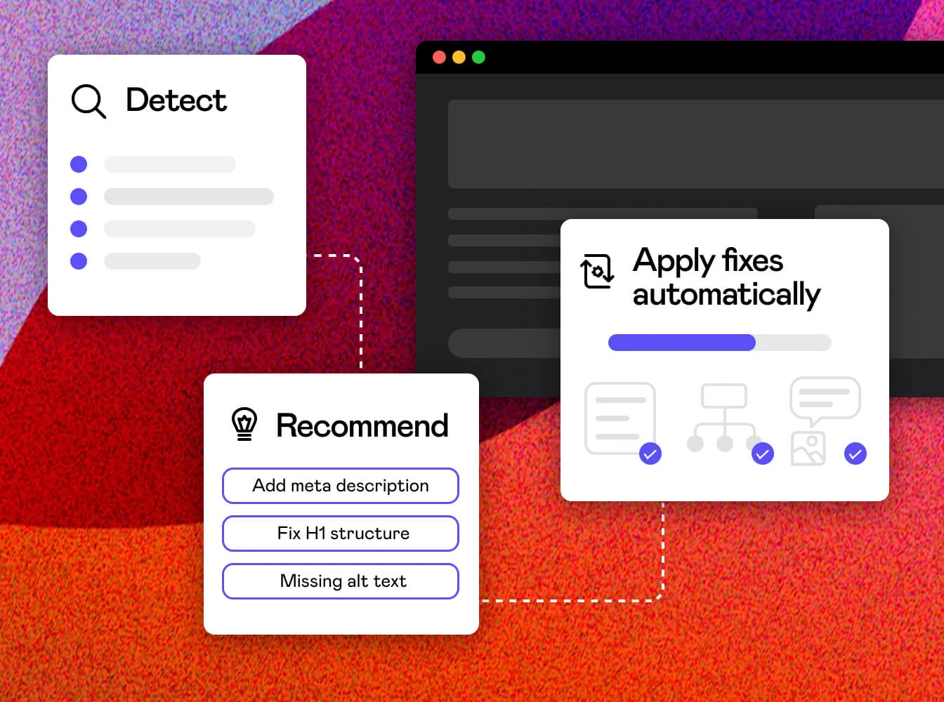 AI agents automatically detect optimization gaps, recommend fixes, and apply updates across your entire content inventory, delivering better search and AI engine visibility.